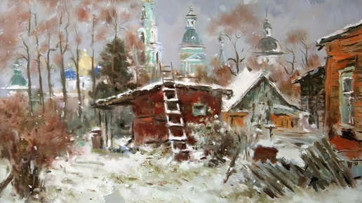). Рождество. Вот как пишет об этой картине Татьяна Несветайло, искусствовед из Санкт-Петербурга. … автор чутко уловил в незатейливом пейзаже определенную символику и продумал каждую деталь холста. Бытовой элемент - лестница в центре композиции – превращается в вечный символ духовного восхождения...
