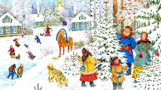 Московская художница - иллюстратор Елена Уварова сумела сохранить с детства веру в сказку и дарит свои сказочные картины нам, зрителям. Как знакомы и близки нам эти русские зимние забавы. Мы видим здесь и катание с горок и, как семья выбирает ёлочку к Рождеству Дети вовсю резвятся на улице, не обращая внимание на снег и мороз. Все одеты тепло, и никто не спешит домой.