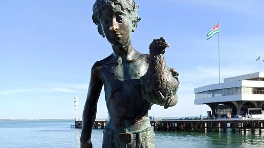 курицей под мышкой. Это - Чик, герой знаменитого цикла рассказов Фазиля Искандера "Детство Чика". Скульптура появилась в 2011 году и стала первым в Абхазии памятником литературному герою. Автор работы - молодой скульптор Архип Лабахуа. По сюжету, мама попросила мальчика зарезать курицу, но Чик не смог этого сделать - ему стало жалко птицу. «Мгновенно увидел сцену, переживание Чика, когда он резал механически головы курицам и, вдруг какая-то жалость возникла, ведь есть дети, которые вообще не жалеют ни куриц, муравьев», - рассказывает Лабахуа...