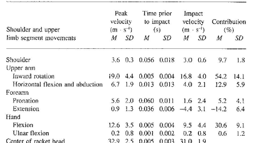 Contributions of Upper Limb Segment Rotations During the Power Serve in Tennis ElliottServeJAB.pdf В высокоскоростной подаче в теннисе вклад анатомических вращений сегментов верхней конечности в скорость головки ракетки в момент удара зависит как от их угловой скорости, так и от мгновенного положения ракетки относительно осей вращения этих сегментов. Одиннадцать высококвалифицированных теннисистов были сняты тремя камерами Photosonics с частотой 200 Гц во время выполнения мощной подачи. Трёхмерные...