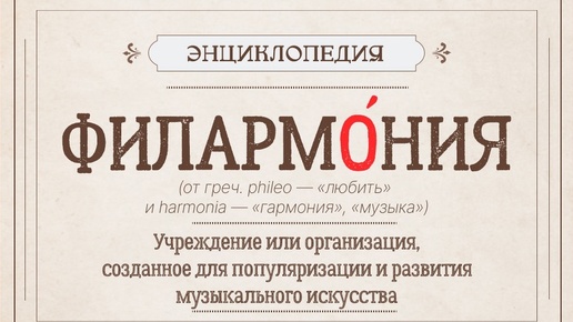 Филармония (от греч. phileo — «любить» и harmonia — «гармония», «музыка») – это учреждение или организация, специально созданные для популяризации и развития музыкального искусства, просвещения населения и воспитания в нём высокого художественного вкуса. То есть, это не только здание, где проводятся концерты, не просто место для прослушивания музыки, а настоящий культурный центр, объединяющий людей; храм, где воспевают искусство. Филармонии знакомят слушателей с музыкой различных жанров, эпох и стилей:...