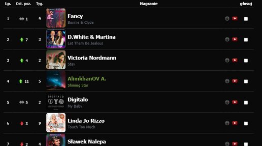 27 апреля 2024 на польском радио RM-80 вышел очередной еженедельный хит-парад исполнителей Italo Disco New Generation. По итогам этой недели ПЯТЬ песен российских проектов вошли в "Горячую десятку" NEW Italo Disco, причем ЧЕТЫРЕ из них оказались в пятерке лучших песен. Основная ДЕСЯТКА Победитель этой недели - 77 летний немецкий певец, популярный исполнитель итало-диско Fancy с песней 2024 года "Bonnie & Clyde". Российско-польский дуэт D.White & Euro Martina с песней "Let Them Be Jealous" на ВТОРОМ месте!!! Поздравляем команду Дмитрия Белого с блестящим результатом...