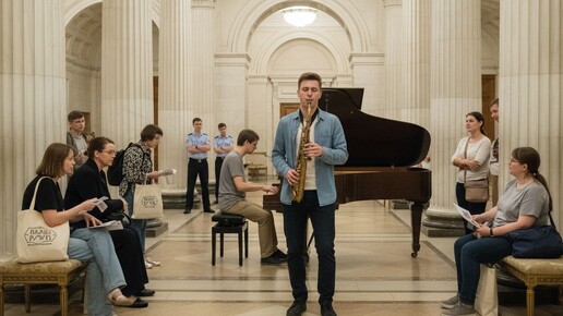 В городе М в эти выходные фойе филармонии временно сменило амплуа: вместо привычных очередей к гардеробу там устроят короткие дневные сеты молодых саксофонистов и пианистов. Вход свободный, но с условием — не занимать проход и не спорить с охраной, которая впервые в жизни будет слушать соло, а не шорох пакетов. Первый сет начнётся в 15:00, дальше по расписанию «кто успел — тот и сыграл». Идея выросла из мастер-класса, который местная джазовая школа провела «по мотивам разговоров о том, как это делает Игорь Бутман»...