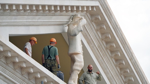 17 июня 2025 года. Россия, Донецкая Народная Республика, город Мариуполь. Узнаваемая во всем мире архитектурная достопримечательность приморской столицы региона - здание русского драматического театра - выходит на финишную прямую восстановления. Яркий памятный момент этого этапа - установка на фронтон объекта культуры первых из девяти восстановленных фигур. Корреспондент «КП Донецк» побывал на строительной площадке и запечатлел это историческое событие. ИСТОРИЧЕСКИЙ КОЛОРИТ СОХРАНЕН Все наружные работы в рамках реконструкции драмтеатра уже выполнены на 90%...