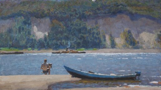 На картине Николая Галахова запечатлен художник за работой на пленэре: с этюдником он сидит на берегу реки и пишет на открытом воздухе. Вместе с тем картина Галахова — это пейзаж, который также отвечает всем принципам пленэрной живописи. В первую очередь картина наполнена воздухом, светом и передает состояние летнего солнечного дня. Давайте разберемся, что еще характерно для живописи на открытом воздухе. Под открытым небом, в световой среде, отличной от интерьера, живопись приобретает иной смысл и содержание, нежели в работе, написанной в мастерской...