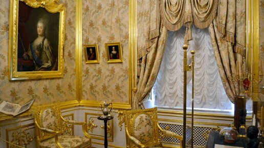 В «Корпусе под гербом», где сегодня находится Особая кладовая, располагались комнаты для особо почетных гостей. Там же были покои Екатерины II. Да, Большой дворец был парадной резиденцией, а императоры тоже люди, им уюта хочется. Как обещала, сегодня идем дальше по Особой кладовой Петергофского Большого дворца. Для тех, кто пропустил начало, ссылку оставлю ниже. Вот кабинет Екатерины II. Собственный парадный портрет на стене, рядом - портреты родителей. Стены обиты золотистым шелком, мебель соответствует...