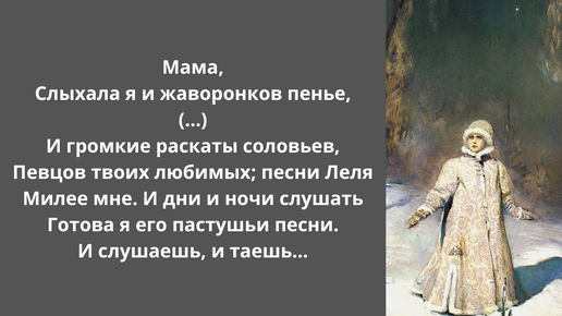 Что символизирует главная героиня пьесы и чему хочет нас научить эта "Весенняя сказка", написанная А.Н. Островским в конце весны 1871 года? Чтобы ответить на эти вопросы, проанализируем образ главной героини пьесы. Сначала - о внешнем, о том, что на поверхности. Холодная и манящая красота С первого взгляда снежная пришелица из иного мира могла бы показаться ведьмой, так как в определенном смысле приносит жителям села беды и раздоры. Простая земная девушка жалуется на Снегурочку в беседе с ней же:...