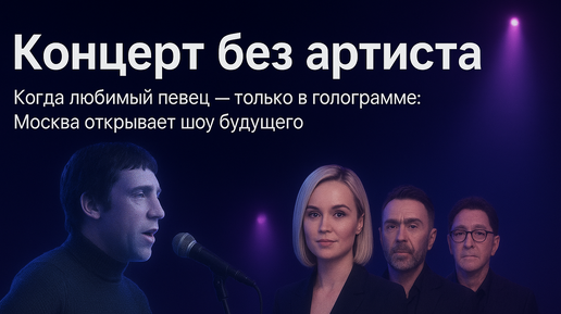 В Москве проходит концерт… без живых артистов. На сцене цифровой аватар Владимир Высоцкий, а рядом — виртуальные образы Полина Гагарина, Сергей Шнуров, Григорий Лепс и Сергей Безруков. Проект обещает цифровую магию, воссоздающую оригинальное звучание знаменитого барда. Организаторы решили оцифровать популярных музыкантов: снять 3D-сканы, воссоздать движения и голос и вывести на сцену полностью виртуальный спектакль. Зритель получает шоу, похожее на концерт, но без «человеческого фактора» — никакой задержки, никакой усталости, никакой скуки между песнями...