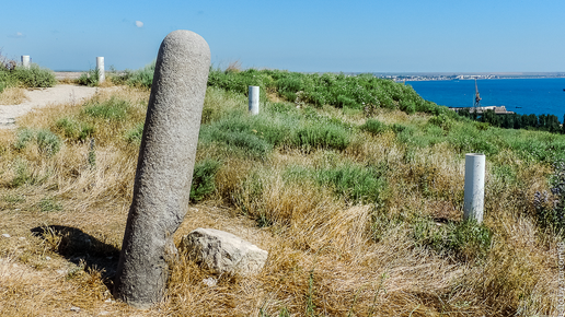 Познакомившись в прошлом репортаже с остатками средневековой башни Святого Фомы на горе Митридат в Феодосии и совершив небольшой экскурс в историю строительства генуэзской крепости Кафа, стоя прямо на макушке горы, обратим внимание на бетонный столб странной формы, расположенный рядом со смотровой площадкой. При ближайшем рассмотрении он оказался каменным с не очень хорошо обработанной поверхностью. Наверняка когда в глубокой древности его вырезали из цельного куска камня лазеры еще не достигли своего совершенства и поверхность получилась не ровной...