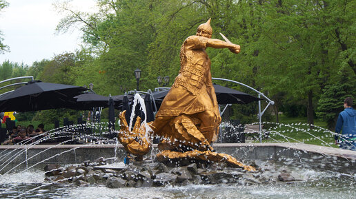 В Ростове-на-Дону, на пересечении Буденновского проспекта и улицы Красноармейской, есть небольшой фонтан. Скульптурная композиция фонтана представляет из себя богатыря и змея, но выглядит их "противоборство", право, крайне любопытно. Вот, взгляните: Основной элемент сей структурной композиции - богатырь (старожилы Ростова почему-то зовут его Самсоном), наносящий размашистый удар мечом по... Кому-то. Никакого обозримого врага в плоскости удара не прослеживается. Только небольшой двухголовый змей прячется у ног витязя от неведомой опасности...