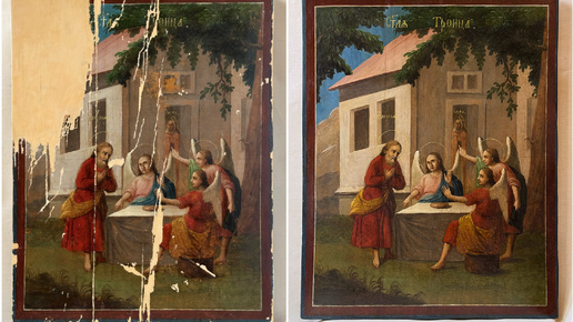 Реставрация иконы Святая Троица (Гостеприимство Авраама) 19 века с воссозданием выломанного фрагмента доски и реконструкцией изображения