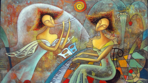 Картина Гранта Сукиасяна. Как называется, не знаю. Могу предположить, что "Муза". Художник - символист, картины у него странные и чудесные. На всех - прекрасные дамы, тонкие, возвышенные и неземные. А что может быть более неземное, чем музыка? Поэтому так часто художник изображает прелестных девушек с разными музыкальными инструментами, в паре с поклонниками, по одиночке или группами. Его очаровательные женщины похожи на инопланетные цветы. Птицы тоже связывают небо и землю, поэтому так много птиц в работах Гранта Сукиасяна, таких же необыкновенных птиц, как и все вокруг...