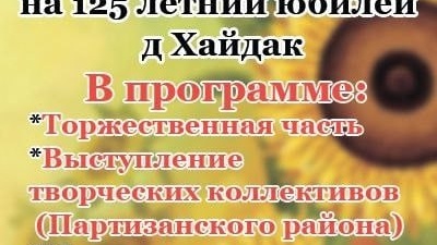 19 июля в 11:00 СДК деревни Хайдак приглашает всех жителей и гостей на праздничное мероприятие, посвященное 125-летию деревни Хайдак. Встреча состоится на площади сельского клуба по адресу: Хайдак, ул.Центральная, 56. В программе празднования запланированы торжественная часть и выступления творческих коллективов Партизанского района...