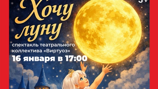 ✨ Хотите ненадолго поверить в чудеса? Тогда вам к нам! 16 января в Павловском СДК театральный коллектив «Виртуоз» покажет спектакль «Хочу луну» — волшебную историю по сказке Элинор Фарджон. Маленькая принцесса мечтает достать луну снеба… Что из этого выйдет? Узнаете на спектакле! Когда: 16 января, начало в 17:00. Где: Павловский СДК. Вход свободный, возрастная категория: 3+...