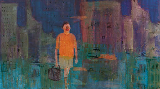 Человек в большом городе. В руках у него сумка – может, он решил смыться куда-нибудь, например к маме в деревню, а может его жена за картошкой отправила. Футболка на человеке яркая, веселая, и лицо у него тоже негрустное, и походка бодрая...