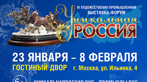 С 23 января по 8 февраля 2026 года, в Комплексе Гостиного двора г. Москвы, на одной из самых престижных площадок столицы, пройдет VI Художественно-промышленная выставка-форум «Уникальная Россия». Крупнейшая в нашей стране выставка традиционных и современных искусств откроет культурный год, который объявлен указом президента Владимира Владимировича Путина Годом единства народов России. «Уникальная Россия» - это: · более 20 выставок и арт-проектов внутри одной выставки, · более 4000 участников из 77...