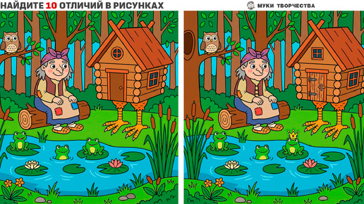 Перед вами два похожих рисунка с Бабой-Ягой и избушкой на курьих ножках на болоте. Художник искусно сделал 10 различий в этих рисунках. Найдите все 10 отличий, проверив свою внимательность. У задачки простой уровень сложности, но это не значит, что будет легко. Из-за обилия деталей на рисунке, найти отличия получится не сразу. Но я в вас верю...