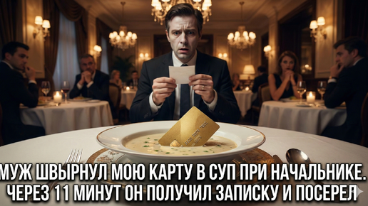 Муж швырнул мою карту в суп при начальнике: «Ты на это не заработала!» Через 11 минут официант передал ему записку, от которой он посерел