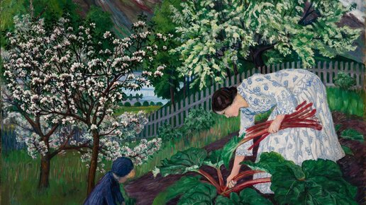 На переднем плане данной картины поздней карьеры норвежского живописца Николая Аструпа (годы жизни 1880-1928) женщина справа в платье с бело-голубым узором, с тёмными волосами, собранными на затылке, наклоняется в саду, собирая стебли красного ревеня. Слева от нас светловолосый ребёнок в тёмной кепке и пальтишке стоит на коленях на краю сада, зарывшись обеими руками в грязь. За фигурами наш взгляд находит вишнёвые деревья в цвету и белый частокол, который тянется вниз по склону покрытого густой травой зелёного холма...