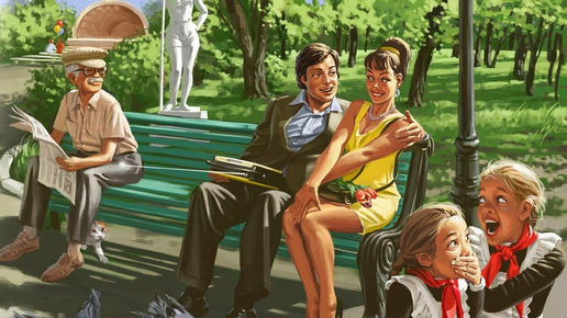 Думаю, что смеются они над пенсионером с газетой и влюбленной парочкой. Нет, чтобы предупредить, что скамейка только что ими покрашена в зеленый цвет, а они давятся от смеха...