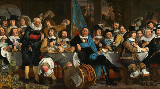 Голландский художник Бартоломеус ван дер Хелст (ок. 1613-1670) на своей картине запечатлел конкретный день — 18 июня 1648 года — и конкретное событие — празднование в честь Мюнстерского мира (окончание войны с Испанией). Руководители гражданской гвардии Амстердама пожимают друг другу руки в знак мира, и передают по кругу рог для питья. Они рады, что их оружие наконец-то сложено, о чем свидетельствует стихотворение на барабане. Окончание Восьмидесятилетней войны отмечается выпивкой и изысканными блюдами...