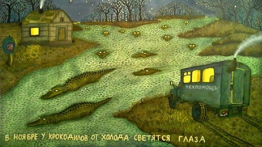 Любопытный художник Егений Бутенко рисует изумительные картинки. Что там в его художественном мире? "Заиндевшие витамины", только подумайте. Или внезапная "вставная челюсть города в утренней дымке". Вот в лечебной ноябрьской грязи возлежит хищного вида поросюшка, попивая коктейль на утреннем морозе. Её костыли-арфы лежат рядом, брошены, явно символизируя искусство. Что это за свинья такая? Возможно, художник пытается сказать что-то вроде: без искусства все мы деградируем. Впрочем, мы способны деградировать и с искусством, дорогие друзья...