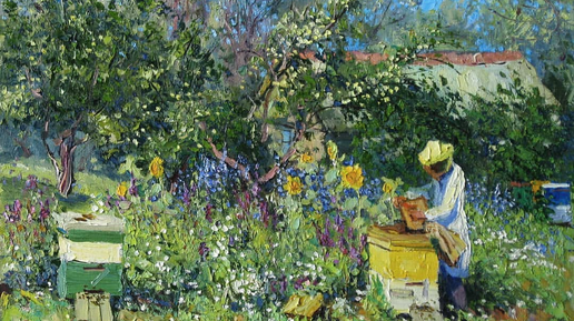 Сегодня поговорим о картинах нашего современника Дмитрия Львовича Сысоева. Больше, чем восхищаешься — словно видишь восхищение, в картине запечатленное. В этой картине даже аромат яблок ощущается. Они, кажется, совсем рядом. Деревья собой всю атмосферу картины заполняют. Так прекрасны, что дом в их окружении кажется столь же восхищенным, как и зритель, будто в картине находящийся. В этой картине цветущие деревья словно на сцене. Дерево перед зрителем дирижеру подобно — ветвей словно взмах. Оркестр весны в своем грандиозном звучании...