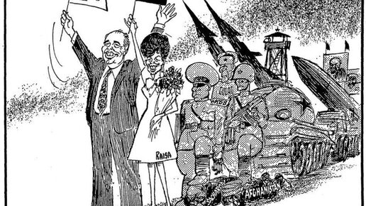 За спиной Михаила Сергеевича, дружелюбно размахивающего флажком с голубем мира, и его жены Раисы с букетом цветов — мрачный...
