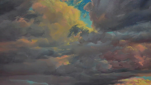Эта картина дала идею новой публикации, её названия, начало новой галереи картин с необычным сюжетом, изображающих ежесекундно изменяющуюся субстанцию — НЕБО. Всмотритесь в картину: здесь целая симфония красок, оттенков, круговорот немыслемых форм и сочетаний. Недвижно облака повисли над землей...