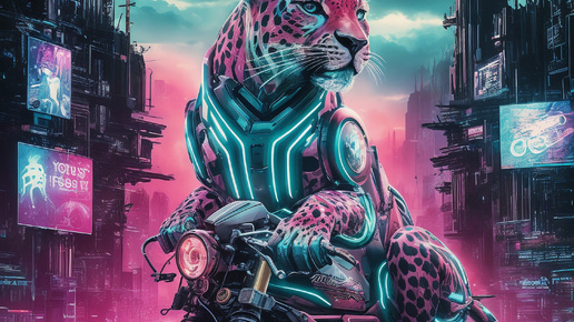 Современный художник: Ворогушин Алексей Геннадьевич. Ягуар на мотоцикле в стиле киберпанк. Оценка и анализ нейроарта при помощи ИИ.