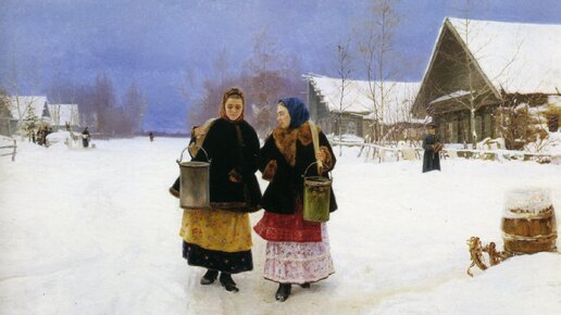На этой картине мы видим двух девушек, которые идут с коромыслами по тропинке в заснеженной деревне. На первый взгляд они мило о чём-то беседуют, но на самом деле между ними существует соперничество, которое умело завуалировано художником...