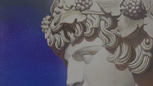 Художник Иван Коршунов. "Вечерний Дионис" 2025 г. холст, масло В сюжете -- русская деревня и античная скульптура. И бескрайнее звездное небо, занимающее основное пространство полотна. Воплощенное олицетворение Вечности. Метафизику сюжету также придает отсутствие изображения человека, хотя, он здесь -- незримо. В окнах дома горит свет, есть жизнь. Эта работа художника Ивана Коршунова, как и все другие его произведения полна парадоксов. Образы сочетаются скорее ментально, чем соответствуют друг другу в реальности...