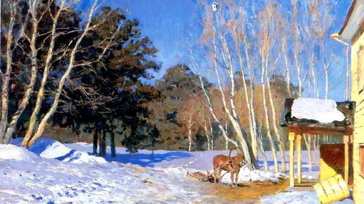 В 1894 году русский последователь французского импрессионизма Константин Алексеевич Коровин пишет картину "Зимой". Перед нами простой и близкий каждому русскому человеку сюжет- уютный деревенский домик, забор и лошадка, запряженная в сани. Приехавший человек только что вышел из саней и еще не забрал свои вещи. Эта картина Коровина близка импрессионизму - эскизность исполнения, широкий мазок и запечатление ускользающего мгновения. Палитра художника кажется, на первый взгляд, очень скудной и " серой"...