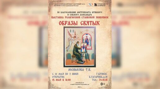 В Брянске открылась персональная выставка иконописи «Образы Святых» Татьяны Викторовны Меньковой, члена СХ России. Мероприятие прошло в Городском выставочном зале в среду, 15 мая. На первой персональной выставке Меньковой Татьяны Викторовны представлено более 40 работ. В представленной экспозиции автор решила собрать и показать весь диапазон своего творчества, а не узко–тематическую направленность. Татьяна Викторовна определила и дала ей широкое название – «Образы святых». Менькова Татьяна Викторовна – родилась 18 января 1989 года в Брянске, в семье художника монументалиста Менькова В...