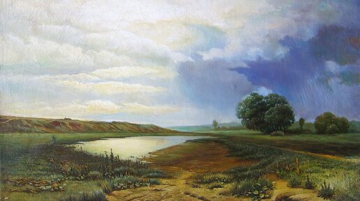 Справа на картине изображена уходящая вдаль угрюмая тёмная туча. Можно вообразить, что совсем недавно здесь шёл проливной дождь, дул ветер, гремела гроза.