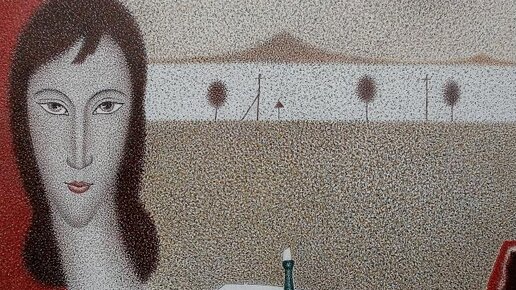 В необычной технике написана эта картина – точками, крапинками, но этим она и интересна. Прекрасная девушка с миндалевидными зелеными глазами и бесконечной стройной шеей, плавно переходящей в открытое плечо...