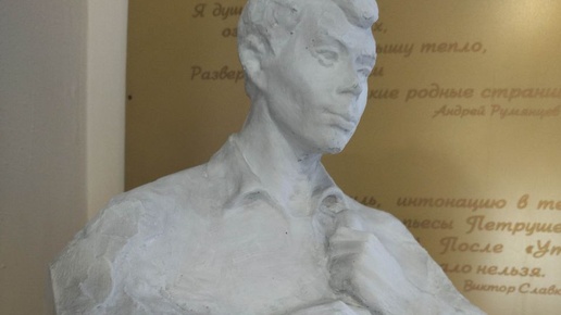 Эта скульптура находится в Мемориальном музее Александра Вампилова, в "театральной" комнате. Автор работы - знаменитый скульптор Анатолий Осауленко. Анатолий Кузьмич Осауленко родился 1 августа 1935 года в дер. Шепелевка Семеновского района Полтавской области. В годы Великой Отечественной войны пережил немецкую оккупацию. В 1962 г. окончил Техникум художественной керамики в г. Миргороде. Работал на стекольном заводе в Дзержинске, хотя всегда хотел работать с металлом, гипсом, гранитом. Искал варианты, где бы мог применить свои таланты...