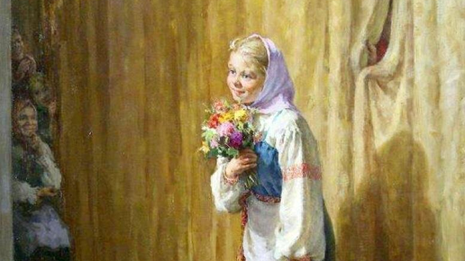 Батюшки, девочку прямо засыпали цветами! Это где ж так? Неужели в деревенском клубе? Ну ладно, не буду придираться. В жизни бы ее просто овациями наградили, но на картине их не изобразишь. Главное-то,...