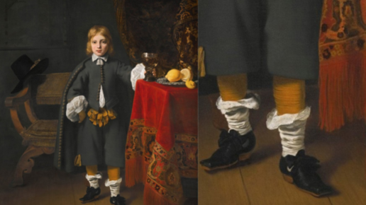 Необычная деталь обнаружена на картине художника Фердинанда Бола «Портрет Фредерика Слюйскена», написанной им в 1652 году. Ее обнаружили посетители лондонской Национальной галереи, в которой сейчас выставлено полотно, пишет онлайн-журнал об искусстве Hyperallergic. На картине изображен восьмилетний мальчик, стоящий возле стола с едой и сжимающий в руке чашку. Он одет в черную куртку, плащ, белую рубашку с воланами, носки и черные ботинки. Однако на обуви Фредерика посетители разглядели белую галочку, похожую на логотип Nike...