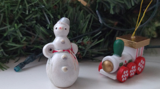 Маленькие друзья Бумажного слоника оказались игрушками из наборов миниатюр, созданных известными советскими художниками-прикладниками, в том числе, на московском заводе Стеклянных Ёлочных Украшений и Оптических Изделий в 1960-х годах. На фотографиях можно подробнее рассмотреть этих малышей, сделанных из колкого пластика. Снеговичок высотой 4 см входил в набор "Зима", придуманный в 1967 году художником Ириной Сергеевной Манухиной (1912- 1990), автором многих кукол, эскизов костюмов к сказке А.С.Пушкина о царе Салтане и миниатюр...
