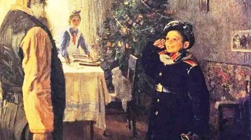 В светлой, уютно обставленной комнате намечается встреча Нового Года, о чем говорит стоящая в углу наряженная елка. Мальчик не старше двенадцати лет, в форме воспитанника Суворовского училища явно только что вошел с улицы, держа в руке чемоданчик, безусловно, с учебными принадлежностями и личными вещами...