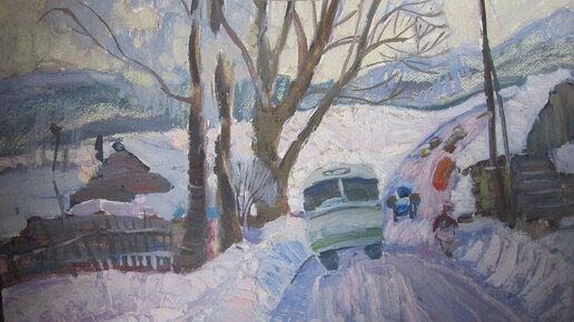 Весел зимний день, несмотря на отсутствие солнца… Почему-то кажется, что к этому городскому пейзажу Вячеслава Николаевича Костина непременно должны прийти стихи. Ну вот, например, быстро найденные строки Юнны Мориц: «Небо стальное в городе зимнем пахнет снегами. Все остальное пахнет бензином и сапогами…». Автобус спешит с пассажирами, спрятанными буднями в его темноватое нутро, и главное движение в картине принадлежит ему. Стоит заметить, что благодаря динамичным мазкам и наклону дороги в картине возникает дополнительное ощущение движения...