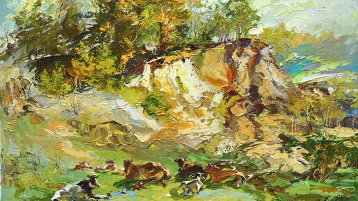 Художник Александр Шадрин. «Полдень» 60х90 хм 2017 г - 150 000 р Жаркий летний день. Идешь, бывало, по лугу, слышишь негромкие звуки колокольчиков, но не видишь, откуда идёт звук. Буквально натыкаешься на лежащее стадо коров , медленно жующих свою «вечную жвачку», лениво обмахивающих хвостом жужжащих насекомых друг с друга, прямо смотрящих в одну точку. Каждая корова смотрит в свою точку. От ярко слепящего солнца стадо видишь не отчетливо, смазано, прямо таки с силой вырывая из общего фона. Вот увидел буренку, кивающую тебе головой, словно в приветствии, и нет ее, пропадает из поля зрения...