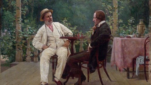 Веранда старинной дачи, прямо за верандой начинается лес. В центре картины две мужские фигуры – в белом и в черном. Какая торжествующая поза того, у которого более выигрышная позиция на шахматной доске! Задумчив и невесел его оппонент...