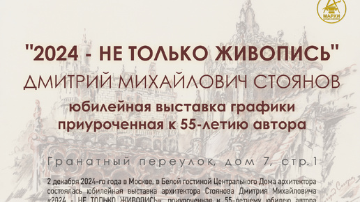 2 декабря 2024-го года в Москве, в Белой гостиной Центрального Дома архитектора состоялась юбилейная выставка архитектора Стоянова Дмитрия Михайловича «2024 - НЕ ТОЛЬКО ЖИВОПИСЬ», приуроченная к 55-летнему юбилею архитектора. ссылка на видео https://cloud.mail.ru/public/MuXx/kCttbwnms Стоянов Дмитрий Михайлович Родился 29 ноября 1969 года. Окончил Московский архитектурный институт в 1994 году. Учился в экспериментальной учебно-проектной группе под руководством профессора В.Г. Тальковского. После окончания института (с 1994 года и по настоящее время) работает в МАРХИ...