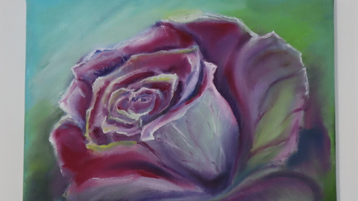 Представленная картина изображает розу крупным планом, демонстрируя мастерство художника в передаче деталей цветка. Лепестки розы выполнены с использованием насыщенных красных и фиолетовых оттенков, плавно переходящих друг в друга...