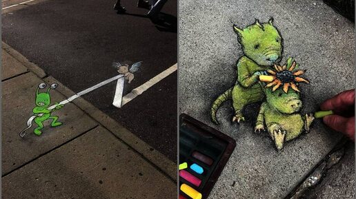 Или как обычный мел может творить чудеса на городских улицах. Американский художник Дэвид Зинн не планирует свои работы заранее ― он позволяет самим улицам подсказывать ему, где должны появиться его очаровательные рисунки. Он создает удивительных персонажей прямо на тротуарах и превращает трещины и пятна в забавные сценки, которые исчезают с первым дождем...