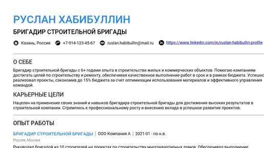 Изучение примера резюме бригады строителей — ваш прямой путь к созданию сильного документа, который привлечет внимание работодателя. Используя проверенные подходы, вы сможете значительно увеличить свои шансы на получение желаемой работы в строительной сфере. В этом руководстве мы предлагаем вам готовые примеры резюме для разных уровней квалификации в строительстве, дополненные подробными пошаговыми инструкциями по каждому разделу. Мы детально разбираем, как правильно представить ваш опыт, образование и ключевые профессиональные навыки, учитывая актуальные требования работодателей...