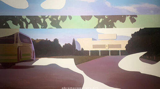 Работа Вадима Леухина «Вечерний автобус» напоминает фотографию из поездки, сделанную на память. Вечерний пейзаж наполнен личным переживанием. Ощущение приближающего вечера, удлиненные тени и сам автобус, будто «покидающий» пределы холста, создают впечатление ностальгии по прошедшему дню. Художник своим характерным приемом перемежает вечерние тени плоскостями локального цвета, разрушающими веру зрителя в реальность изображения. Холст превращается в сцену, декорации к спектаклю, где каждый элемент выполняет свою роль...