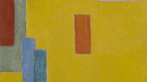 Прямоугольники разных размеров бордового, зелёного, оранжевого, розового и синего цветов парят над полем насыщенного горчичного цвета. Более длинные прямоугольники собираются в левой части полотна, а оранжевые и розовые плавают в невесомости чуть более изолировано. Хотя взаимоотношения между формами и их тесная связь с полем привлекают внимание к плоскости картины, они также создают и вызывающее воспоминания ощущение глубины. Кроме того, роскошна сама фактура произведения, она имеет много общего с текстильными рисунками Ванессы Белл (годы жизни 1879-1961)...